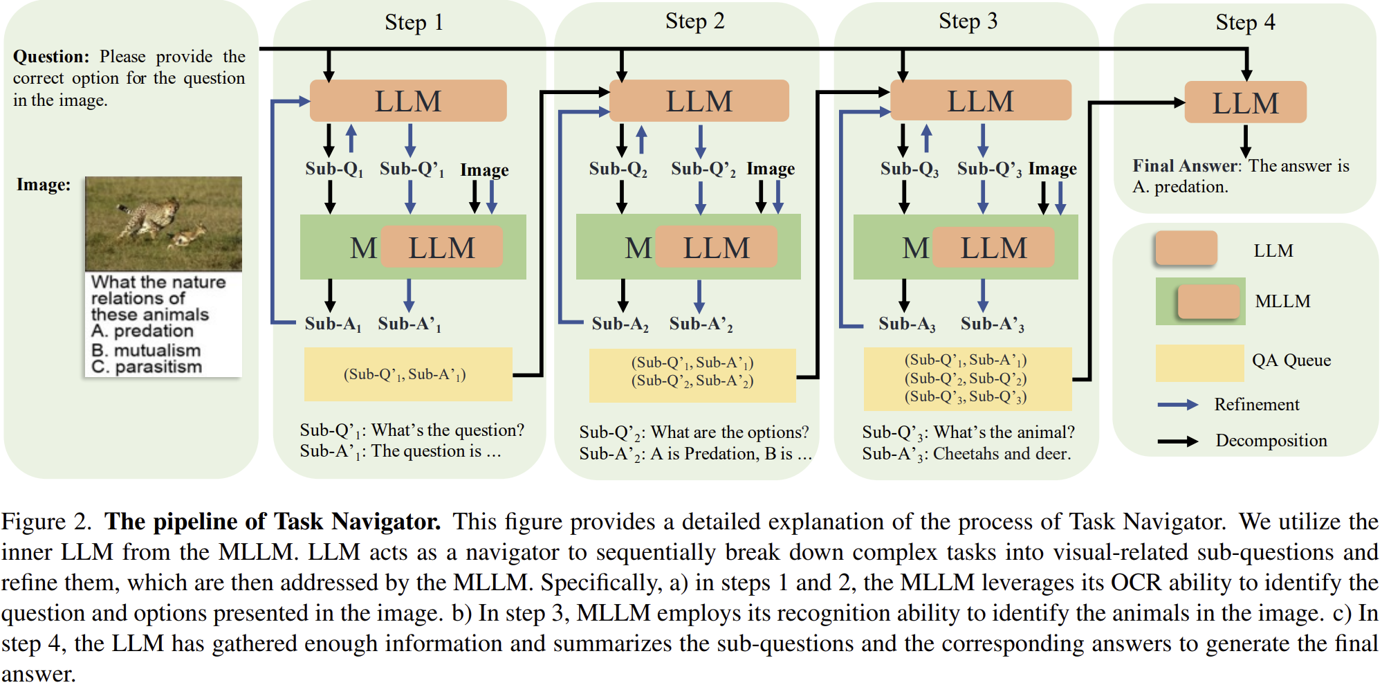 Task Navigator는 LLM과 MLLM의 협업을 대화(dialogue) 루프로 구조화합니다. 이 파이프라인⁸은 크게 ‘질문 분해(Decompose)’ → ‘시각 답변(Answer)’ → ‘정제/다음 질문(Refine)’ → ‘종료(Terminate)’ 네 단계를 반복합니다.