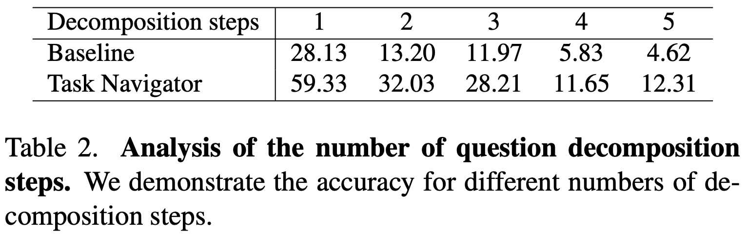 분해 단계별 실험(Table 2)에 따르면 1단계에서 이미 59.33 %(Task Navigator 기준)의 정답률을 보이나, 5단계로 늘어나면 12.31 %로 급격히 감소해 과도한 분해는 오히려 정보 손실과 오류 축적을 야기한다는 점이 드러났습니다.