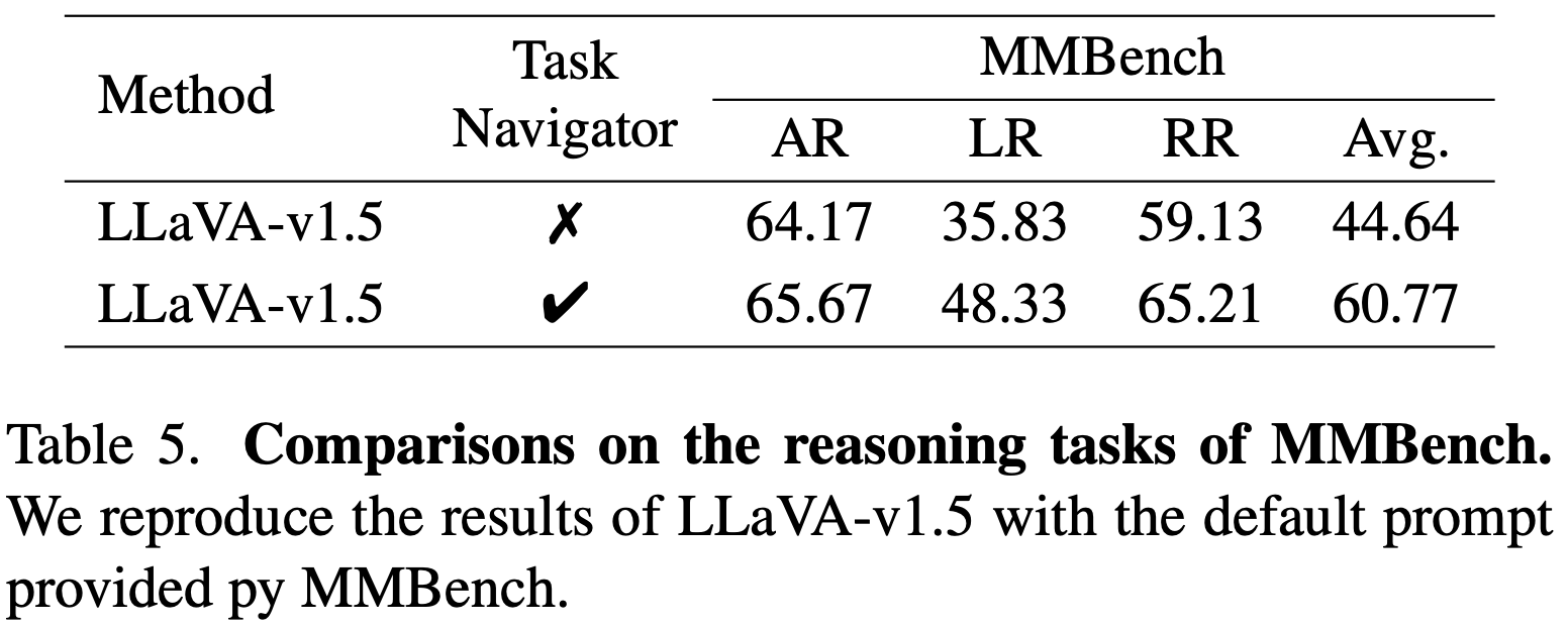 - 실험 결과 Task Navigator는 공개 LLM(Vicuna)이나 상용 LLM(GPT‑4)을 조합했을 때 모두 성능을 끌어올렸는데, 특히 GPT‑4 + LLaVA‑v1.5 구성은 GPT‑4V 단일 모델의 성능에 근접했습니다.