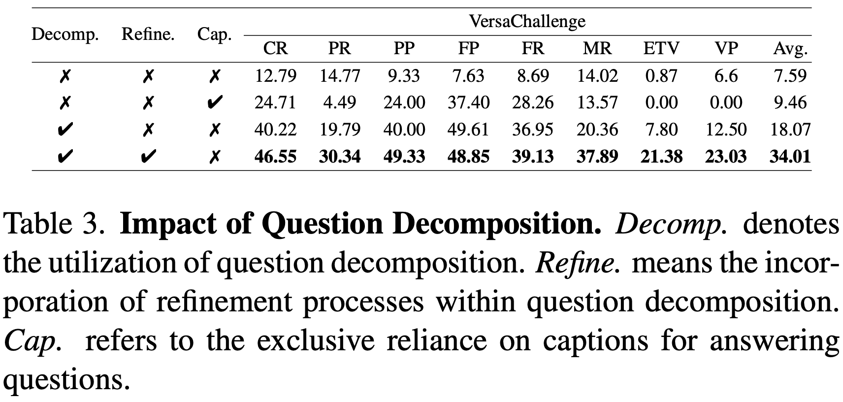 먼저, LLaVA‑v1.5에 질문 분해를 생략하고 이미지 캡션만 LLM에 입력한 경우 평균 정확도는 9.46 pt에 불과했으며, 분해는 했지만 Refinement 단계를 제거하면 18.07 pt로 하락해 Refinement가 성능 향상에 필수적임을 확인했습니다. 반면 분해+Refinement를 모두 적용하면 정확도가 34.01 pt로 급등하며, 세부적으로 PP 49.33, FR 39.13 등 모든 하위 태스크에서 이득을 보였습니다.