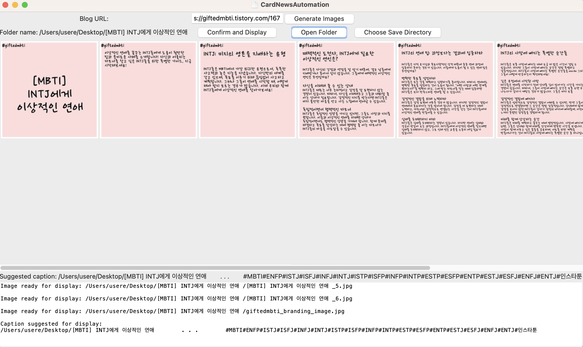 CardNewsAutomation은 블로그 포스트 url을 입력으로 받아 카드뉴스 형태의 이미지를 자동으로 생성하는 Python 프로그램입니다.